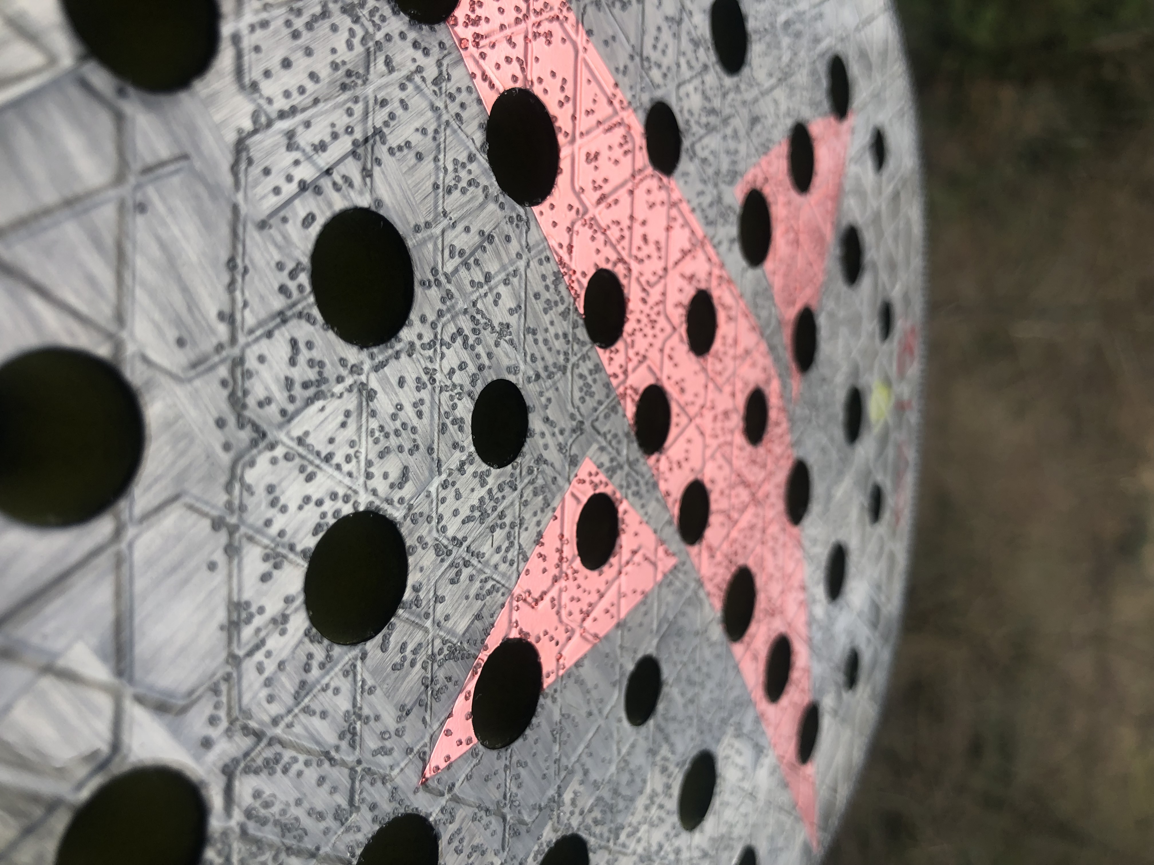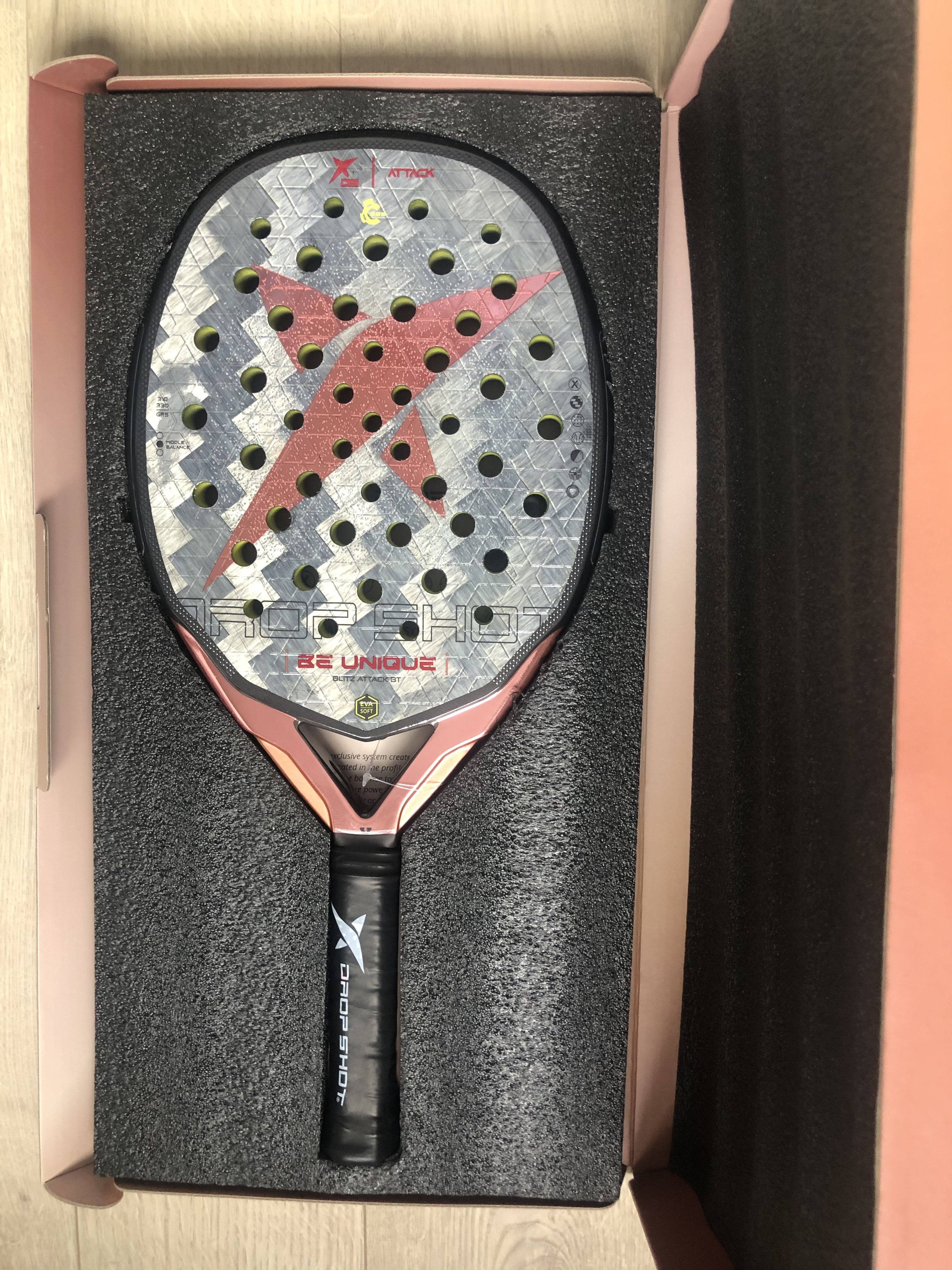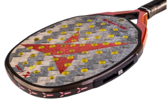 Наполнение: EVA мягкая, это обеспечивает оптимальное чувство контроля. Бьющая часть ракетки выполнена из углерода 24K Silver Twill. Эти плетеные волокна сочетают легкость, гибкость и прочность, обеспечивая быстрый отклик и повышенный контроль в момент нанесения удара.