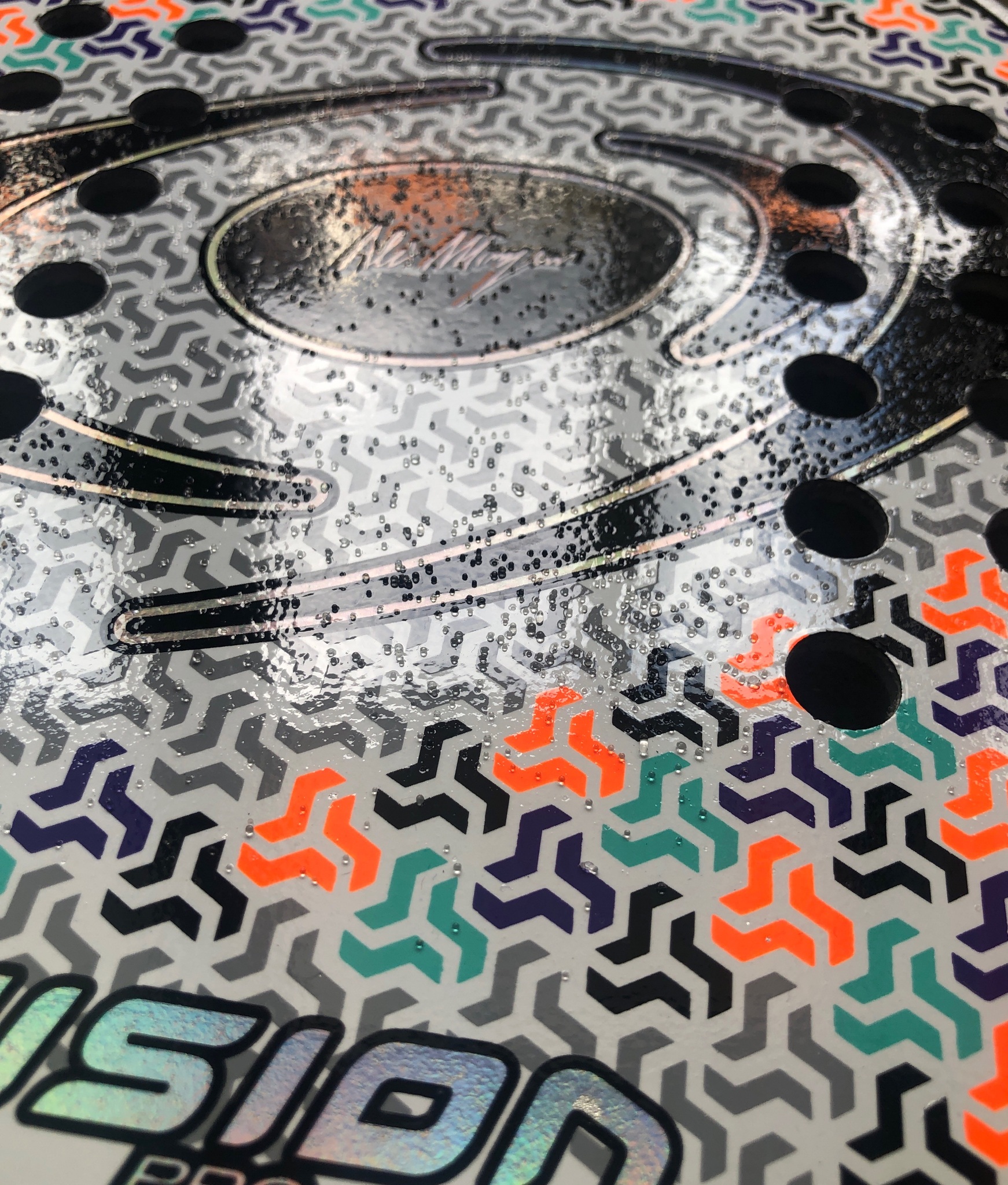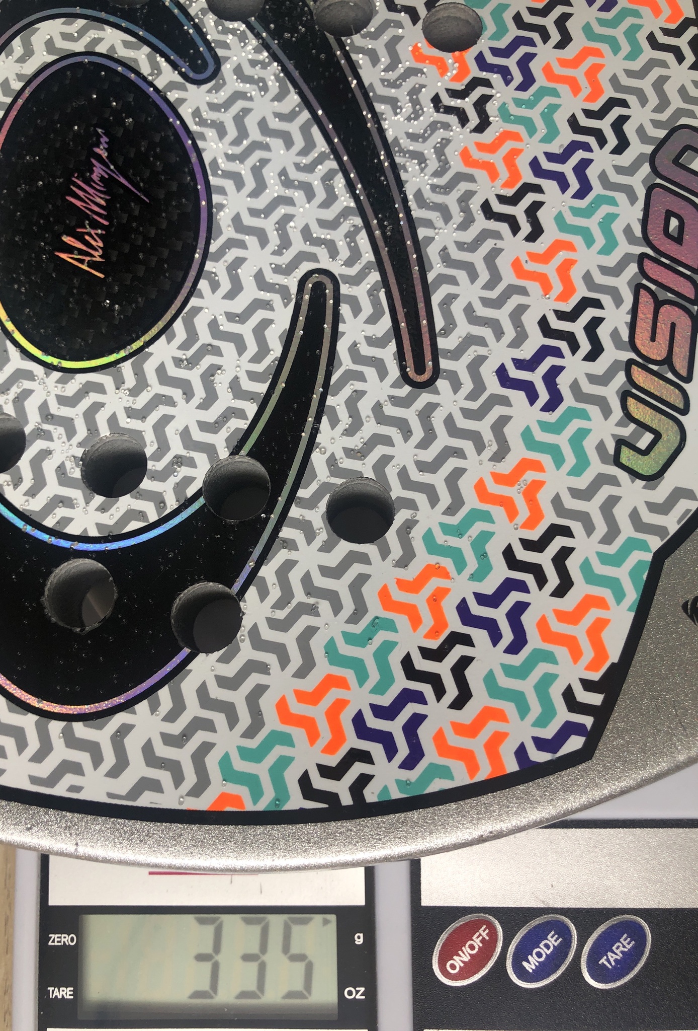 Это «Топовая» профессиональная ракетка Vision. Ракетка для тех спортсменов, которые постоянно ищут совершенство и в игре, и в инвентаре. Ракетка создавалась итальянскими инженерами с использованием технологии «3K Carbon». Именно эта технология обеспечивает с одной стороны плотный, жесткий и сильный удар по мячу. С другой стороны, спортсмены получили надежность в виде беспроигрышного, точного удара. Выверенное расположение отверстий, придает ракетке еще большую эластичность, гибкость и упругость. Все эти технологичные новшества дают возможность профессиональному спортсмену повысить точность удара и увеличить скорость в игре. Теперь вашим соперникам будет не легко, им придется поддерживать ваши скорости, а это сделать будет не просто. Обратите внимание на необычную форму между ручкой и ударной частью ракетки. Этот шестиугольный кремнеорганический орнамент не просто красив. Он обеспечивает комфортное состояние руки за счет стабилизации ракетки после сильных ударов по мячу, а также во время приема смэш. Технические параметры: 100% Карбон 3K, произведенный в Италии. Это материал самого высокого качества, который также используется в Формуле-1 и в MotoGP. Этот карбон обеспечивает оптимальное управление ракеткой и способствует безукоризненным ударам с вращением мяча. Благодаря этому, удалось добиться правильному балансу между игровым комфортом и чувствительностью к мячу. На рисунке ракетки подпись знаменитого Итальянского пляжного теннисиста и тренера Alex Mingozzi (Алекс Мингоззи)